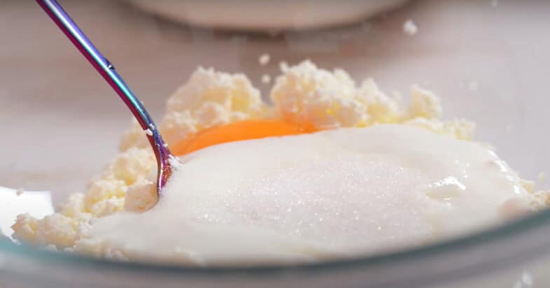 Убедитесь, что все продукты комнатной температуры. В сыр добавляю яйцо, кефир, соль, обычный и ванильный сахар. Хорошо перемешиваю до однородной массы.