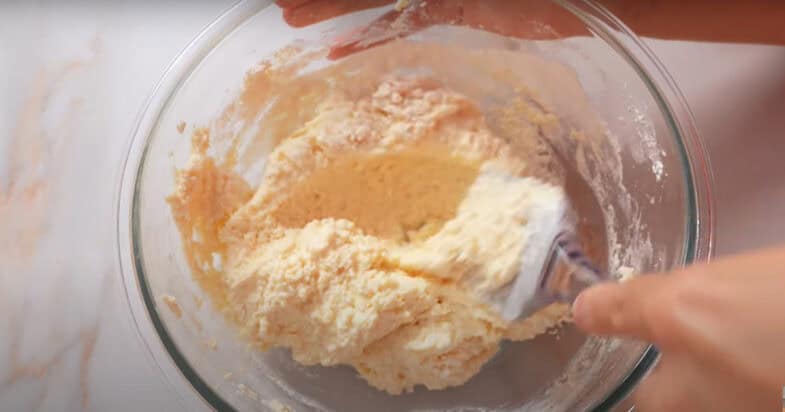 Добавляю муку с содой и замешиваю до однородности. Перекладываю массу в кондитерский мешок.
